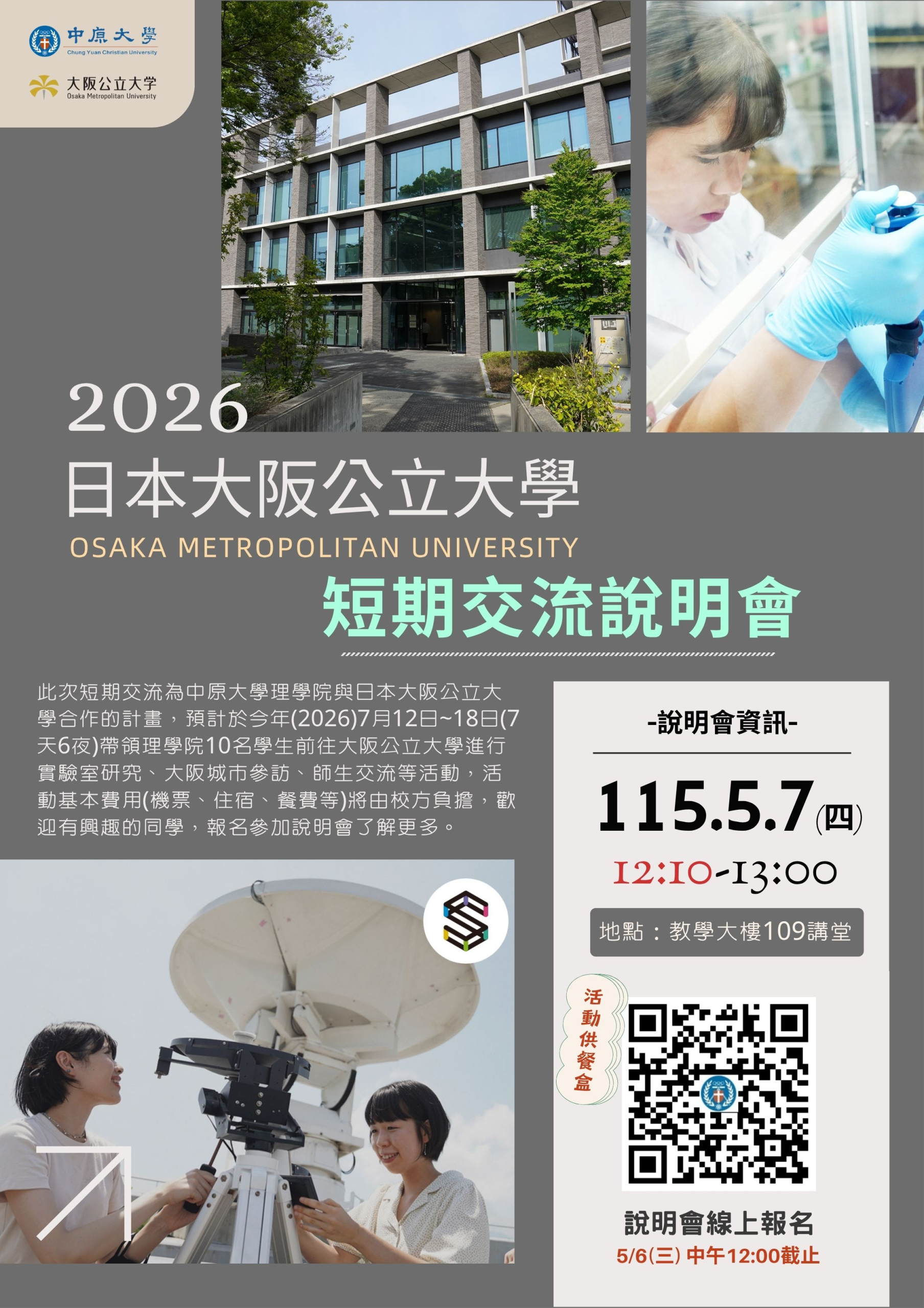 此次短期交流為中原大學理學院與日本大阪公立大學合作的計畫,預計於今年(2026)7月12日~18日(7天6夜)帶領理學院10名學生前往大阪公立大學進行實驗室研究、大阪城市參訪、師生交流等活動,活動基本費用(機票、住宿、餐費等)將由校方負擔,歡迎有興趣的同學,報名參加說明會了解更多。