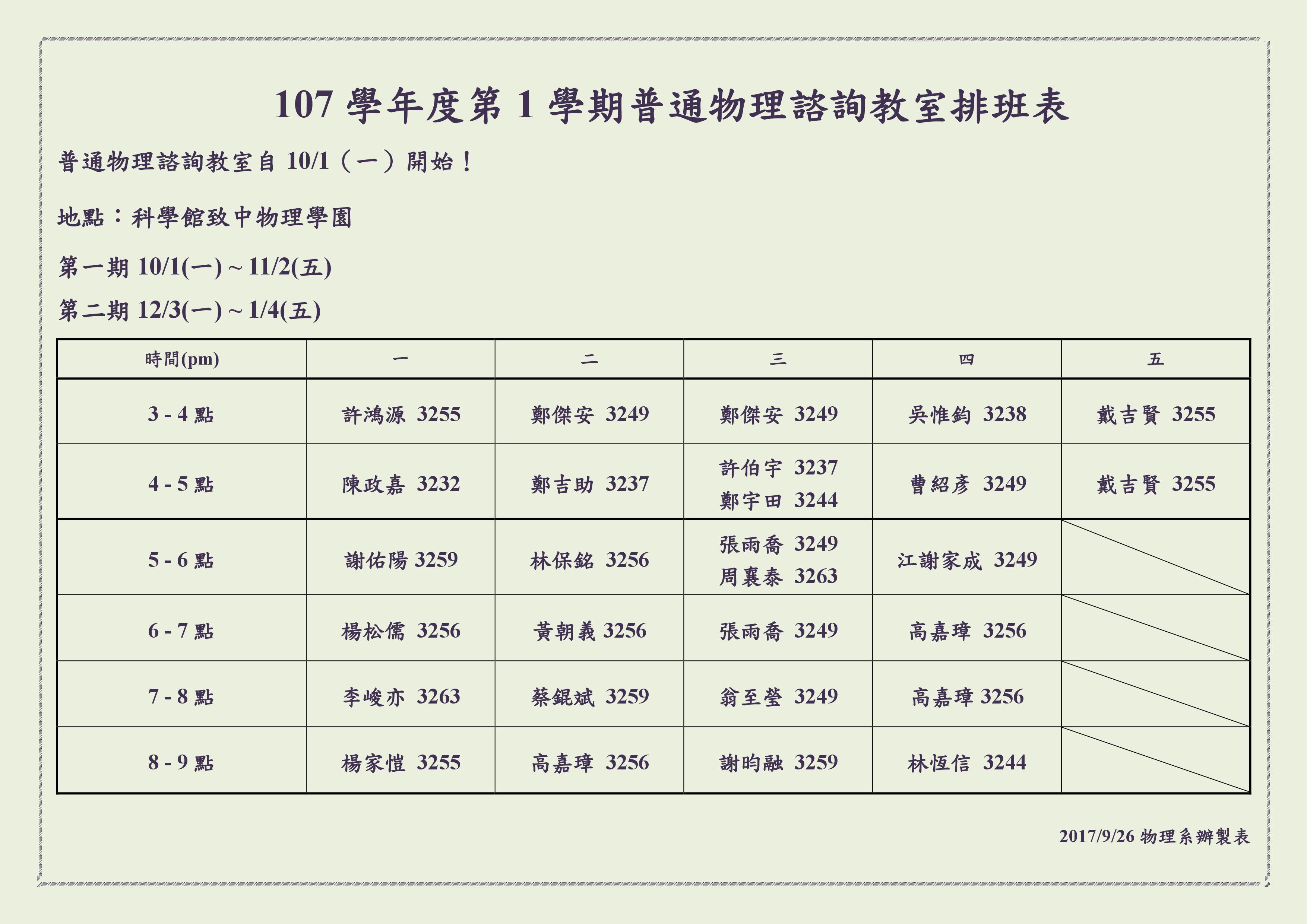 107-1 普物諮詢排班表 107-1 普物諮詢排班表 ^^ 歡迎物理系學生一起來 candygin2018-12-29T16:48:54+08:00 Share This Post, Choose Your Platform! FacebookTwitterLinkedInGoogle+TumblrPinterest