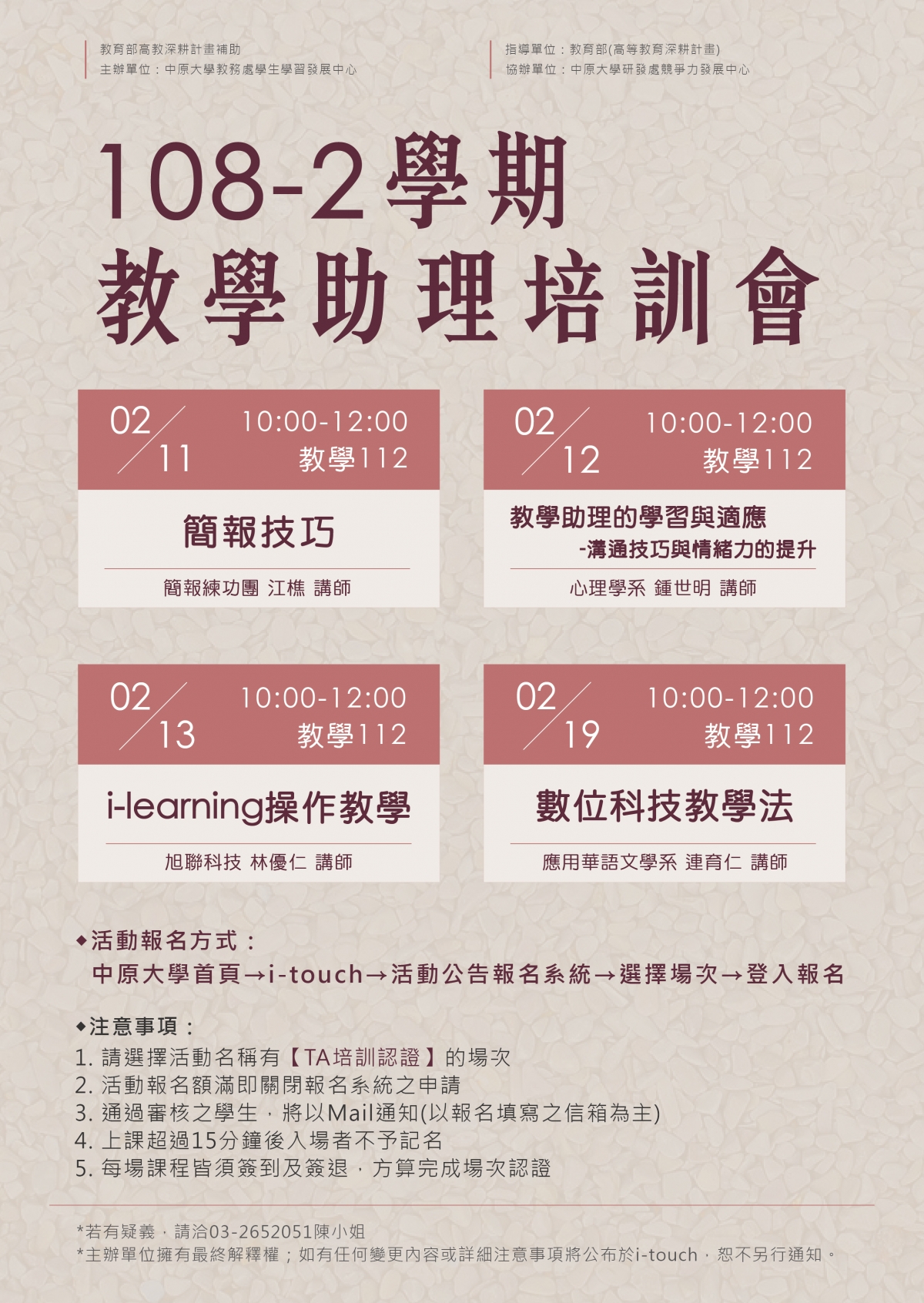 View Larger Image 教學助理培訓會(研究生) 依據本校「中原大學教學助理作業規範」 凡擔任教學助理之學生,須參加教學助理培訓會,才具備教學助理資格。 研究生可至學校活動報名系統報名所欲上課場次 報名時間統一自109/01/21 凌晨0點起開放 活動報名系統網址: https://itouch.cycu.edu.tw/active_project/cycu2100h_06/acpm3/index.html#!/activityList/TIME_OPT=6&ADMIN_GROUP_CODE=200EH 煩請各系協助推廣,尤其是108學年度入學新生。 劉 育彣2020-01-20T11:45:44+08:00 Share This Post, Choose Your Platform! FacebookTwitterLinkedInGoogle+TumblrPinterest