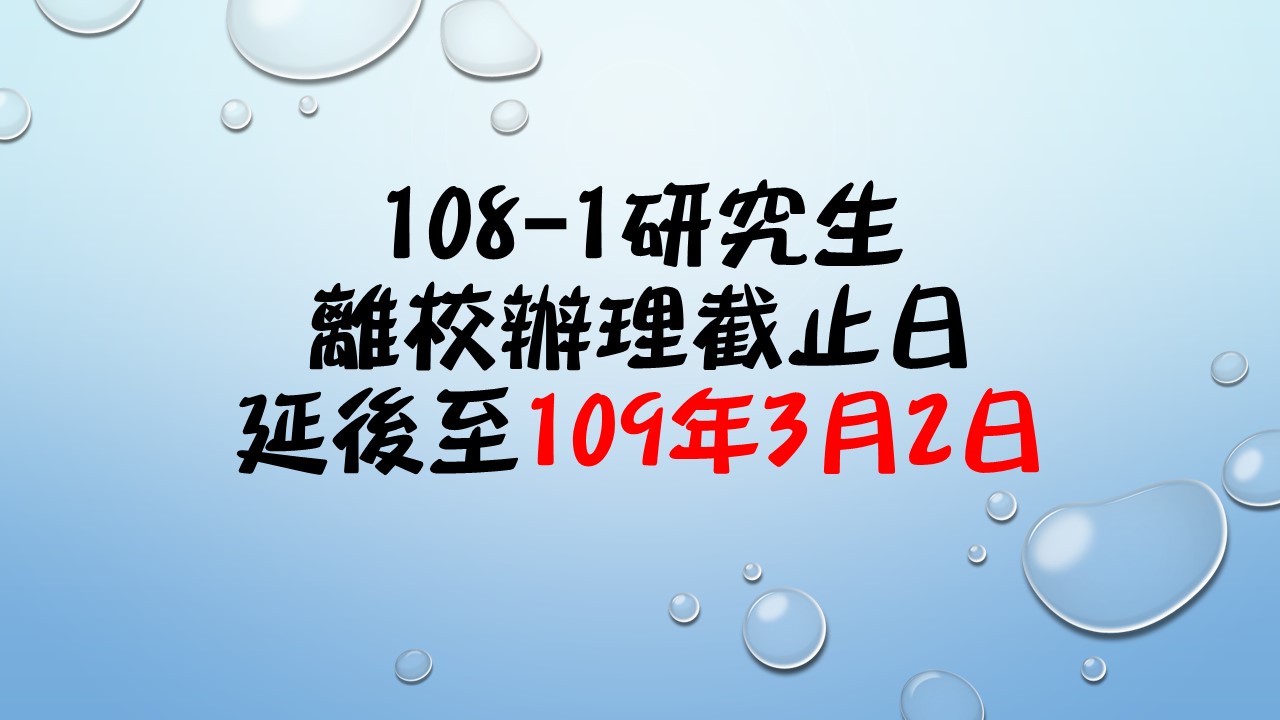 View Larger Image 108學年度第1學期研究生離校辦理截止日,延後至109年3月2日。 ?重要公告? 108學年度第1學期研究生離校辦理截止日,延後至109年3月2日。 因應本校註冊日延後至3月2日, 故延後研究生離校辦理截止日至3月2日, 當天辦理時間:下午14:00-16:00。 辦理地點:維澈樓4樓408室。 3月2日前無法完成離校者,本(108-2)學期需再註冊。 劉 育彣2020-02-17T16:05:14+08:00 Share This Post, Choose Your Platform! FacebookTwitterLinkedInGoogle+TumblrPinterest