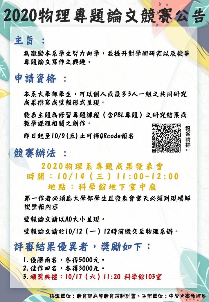 為鼓勵系上同學努力向學,並提升對學術研究以及從事專題論文寫作之興趣,舉辦這次的物理專題論文競賽!!!