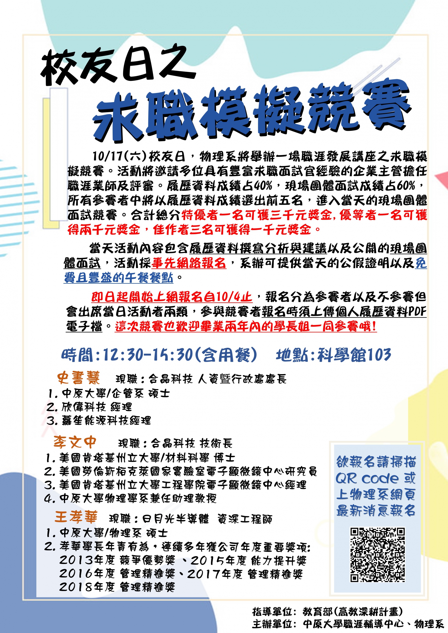 物理系為系上學生將舉辦一場職涯發展講座之求職模擬競賽。講座活動將邀請多位具有豐富求職面試官經驗的企業主管擔任職涯業師及評審,時間也特別訂在10/17(六)校友日中餐後(系辦特別貼心提供豐盛的自助式午餐,以及當時段的公假證明可向運動會活動請假)。當天活動包含履歷資料撰寫分析與建議以及公開的現場團體面試。特別推薦這次精心的求職模擬競賽,對於不久後即將成為職場求職新鮮人的你一定會非常受用。欲參與競賽者報名時須於10/4前上傳個人履歷資料PDF電子檔,方便職涯業師於活動前履歷資料的評比。若不參賽但會出席當日活動者也請上網報名以方便系辦統計人數預備午餐份量。