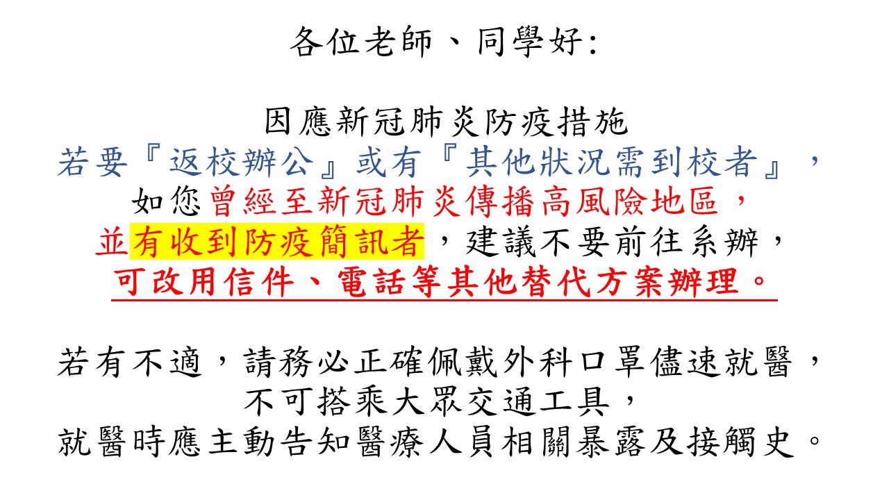 View Larger Image 因應新冠肺炎防疫措施之相關事項 劉 育彣2021-05-18T16:19:30+08:00 Share This Post, Choose Your Platform! FacebookTwitterLinkedInGoogle+TumblrPinterest