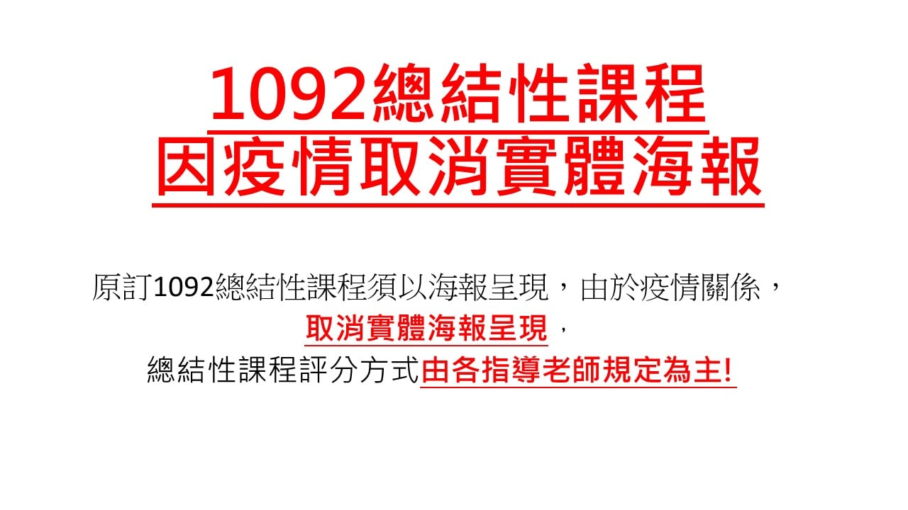 View Larger Image 重要公告-因疫情取消總結性課程海報實體繳交 劉 育彣2021-05-31T09:02:35+08:00 Share This Post, Choose Your Platform! FacebookTwitterLinkedInGoogle+TumblrPinterest