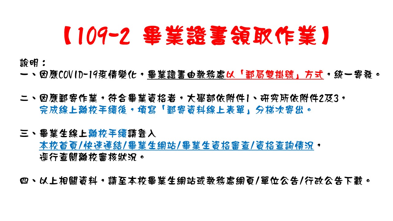 View Larger Image 109-2 畢業證書領取作業 大學部 : 中原大學大學部畢業證書領取作業_ 研究所 : 中原大學研究所畢業證書領取作業_ 中原大學研究生畢業辦理離校手續單_ 劉 育彣2021-06-08T10:16:43+08:00 Share This Post, Choose Your Platform! FacebookTwitterLinkedInGoogle+TumblrPinterest