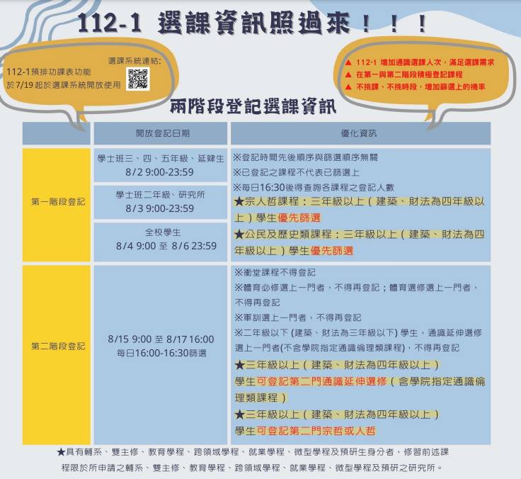 三、選課期間為112年8月2日至112年9月19日止,各階段日程 詳見「選課報報-選課日程表」,注意事項如下: