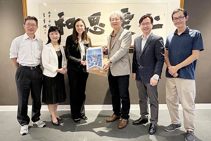 (左起:理學院院長吳宗遠、天普在台辦事處處長蔡宜玲、天普國際助理副校長 Erika、中原大學副校長洪穎怡、國際長魏大欽、物理系主任溫文鈺。)