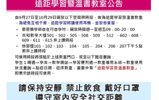 自9月27日至10月29日開放以下空間與時段,做為遠距學習暨溫書教室 慶恩樂學園自在行自學村:開放時間週一至週五09:00-20:00 真知教學大樓501、502、505、508、509